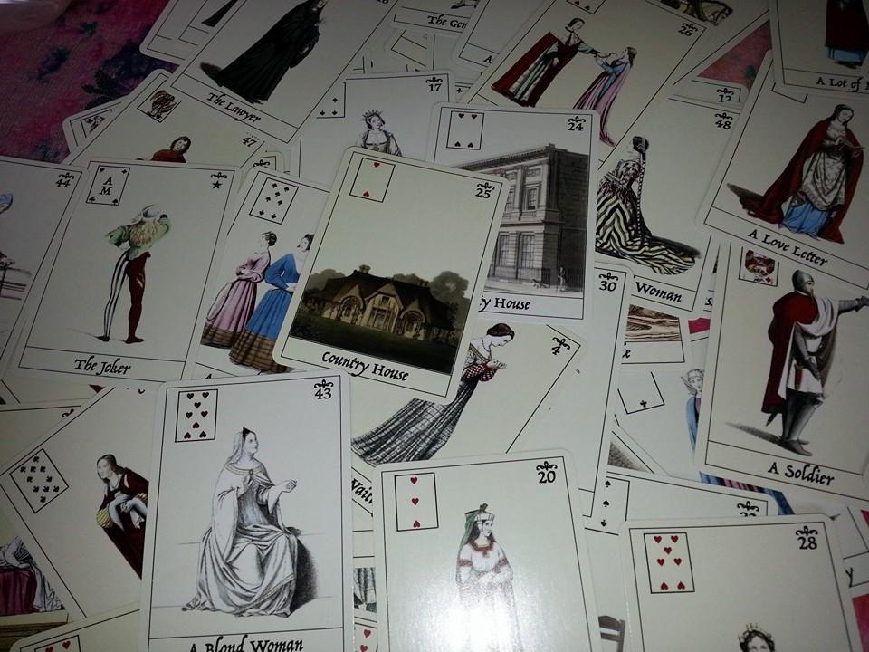 Sibilla Oracle cards were very popular among French diviners and seer during the 18th and 19th centuries. The structure is a regular deck of playing cards with the usual four suits, illustrated with scenes from the daily life of that era and a title for each card. The playing card symbol is shown in the upper left corner and a number in the upper right corner. The Legendary Sibilla Oracle cards have precise meanings – such as “Wedding” or “Trip to the Country” – which make them fun to explore for guidance in everyday affairs. A PDF Guidebook will give you the card meanings and key words for a better understanding of the cards.