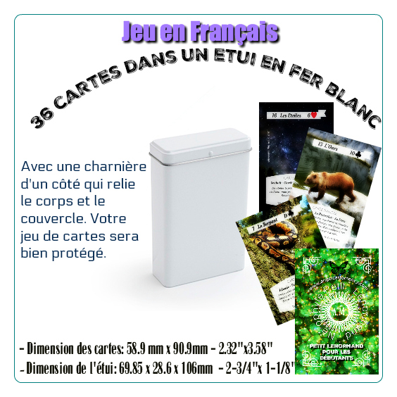 Avec ce jeu, vous avez en main tous ce qui est nécessaire pour débuter et avancer avec l’oracle du Petit Lenormand. Pas besoin de livret ou de fiche car tout est là, écris devant vous yeux !